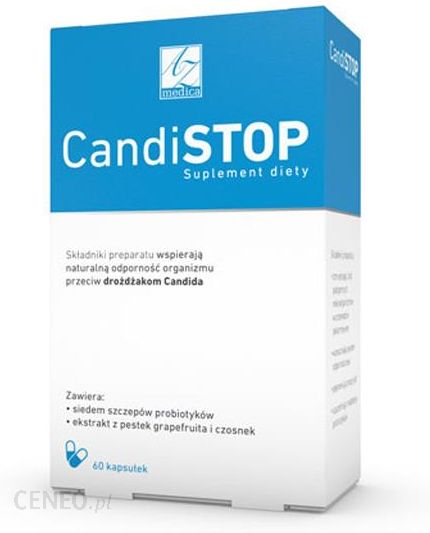 CandiSTOP wspierają naturalną odporność organizmu przeciw drożdżakom Candida.Suplement diety CandiSTOP zawiera wyciąg z nasion grapefruita i czosnek, od dawna znane ze swoich właściwości kontroli rozwoju mikroorganizmów. Znajdujące się w preparacie szczepy bakterii probiotycznych wzbogacają naturalną florę fizjologiczną, a dzięki temu przeciwdziałają rozrostowi drożdżaka Candida albicans. Żyje on w układzie pokarmowym co trzeciego człowieka i zazwyczaj jest niegroźny.Gdy jednak naturalna flora bakteryjna ulega wyjałowieniu, na przykład pod wpływem antybiotykoterapii lub złej diety, to ten niegroźny drożdżak może się nadmiernie namnożyć oraz wywołać szereg przykrych dolegliwości.Substancje o działaniu odżywczym i/lub fizjologicznym:Ekstrakt z pestek grapefruita, suszony czosnek, bakterie probiotyczne: Lactobacillus casei, Lactobacillus rhamnosus, Streptococcus thermophilus, Bifidobacterium breve, Lactobacillus acidophilus, Bifidobacterium longum, Lactobacillus bulgaricus.