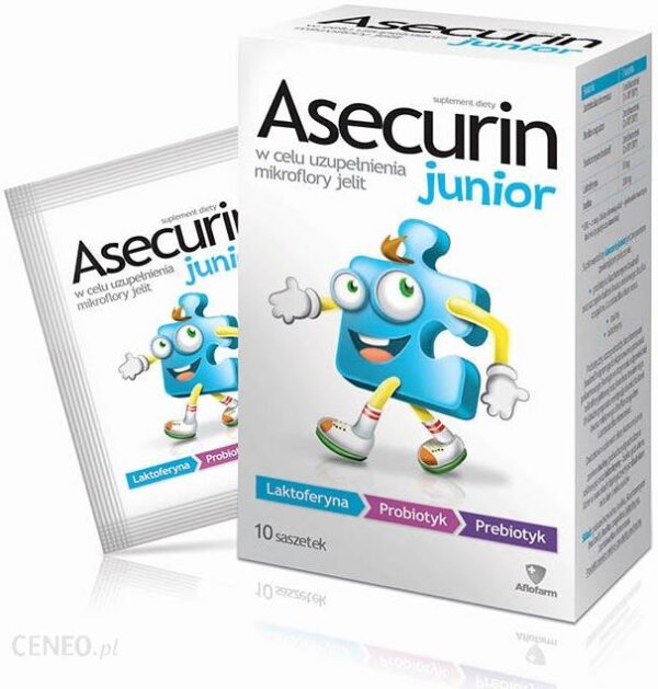 Suplement dietyAsecurin Junior jest preparatem, który zawiera połączenie trzech składników – probiotyku, prebiotyku i laktoferyny. Zawiera probiotyczny szczep drożdży: Saccharomyces boulardi oraz bakterii kwasu mlekowego: Lactobacillus rhamnosus i Bacillus coagulans.Zastosowanie: składniki suplementu diety uzupełnieniają mikroflory jelit; zaleca się stosowanie produktu podczas antybiotykoterapii oraz 2-3 tygodnie po jej zakończeniu.Zalecane spożycie: doustnie; 1 saszetka dziennie. Zawartość saszetki można spożyć bezpośrednio lub po uprzednim wymieszaniu z letnim płynem (np. wodą, mlekiem). Podczas antybiotykoterapii podawać, zachowując co najmniej 2 godzinny odstęp przed lub po przyjęciu antybiotyku.Składniki: glukoza bezwodna, inulina, Saccharomyces boulardii, Bacillus coagulans, laktoferyna, Lactobacillus rhamnosus. Produkt zawiera mleko i produkty pochodne.1 saszetka zawiera: lactobacillus rhamnosus 2 mld komórek (2×109 CFU*), bacillus coagulans 1 mld komórek (1×109 CFU*), saccharomyces boulardii 2 mld komórek (2×109 CFU*), laktoferyna 20mg, inulina 200mg.* CFU – z ang. Colony Forming Unit – jednostka tworząca kolonie (pojedyncza komórka).Przeciwwskazania: nie należy spożywać w przypadku uczulenia na którykolwiek ze składników. Nie zaleca się stosowania u osób z zaburzeniami odporności oraz u osób z założonym cewnikiem do żyły centralnej.Ważne wskazówki:Nie należy przekraczać dziennej zalecanej dawki do spożycia.Suplement diety nie może być stosowany jako substytut (zamiennik) zróżnicowanej diety.Dla zdrowia ważna jest zróżnicowana dieta oraz zdrowy tryb życia.Przechowywać w oryginalnym opakowaniu, w temperaturze poniżej 25°C. Chronić od światła i wilgoci.Przechowywać w miejscu niedostępnym dla małych dzieci.W okresie ciąży i karmienia piersią przed zastosowaniem należy skontaktować się z lekarzem.Produkt zawiera mleko i produkty pochodne.Dodatkowo suplement diety zawiera inulinę (polisacharyd pochodzenia roślinnego) oraz laktoferynę – białko globularne które w warunkach fizjologicznych jest składnikiem m.in. siary i mleka ssaków.Producent:AFLOFARM Farmacja Polska Sp. z o.o.ul. Partyzancka 133/15195-200 Pabianice