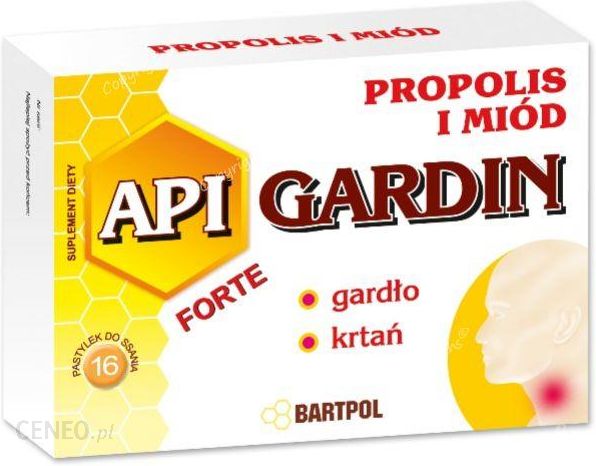 Api Gardin Forte, propolis, miód, 16 pastylek do ssania – opis produktuSuplement diety, którego składniki wspomagają gardło i krtań.Zastosowanie: infekcje gardła i krtani.Zalecane spożycie: 3 – 5 pastylek dziennie.Składniki: cukier, syrop glukozowy, miód pszczeli 2,4%, koncentrat propolisu 2% – substancje czynne.1 pastylka zawiera: koncentrat propolisu 0,07g, miód pszczeli 0,084g.Ważne wskazówki:Nie należy przekraczać zalecanej dziennej porcji.Zrównoważony sposób żywienia i prawidłowy tryb życia jest ważny dla funkcjonowania organizmu człowieka.Suplement diety nie może być stosowany jak substytut (zamiennik) zróżnicowanej diety.Suplement diety powinien być przechowywany w sposób niedostępny dla małych dzieci.Preparat należy przechowywać w temperaturze od 2 – 25 stopni Celsjusza.Osoby uczulone na produkty pszczele nie powinny stosować.Zawiera cukier.Zawiera syrop glukozowy.Producent: BARTPOL s.c.Brzoza 22 D64-553 Grzebienisko