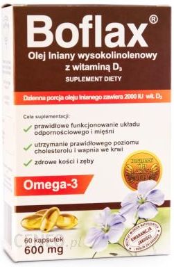 BOFLAX Kapsułki – Olej lniany wysokolinolenowyBOFLAX Kapsułki – Olej lniany wysokolinolenowy to suplement diety pomagający w utrzymaniu prawidłowego poziomu cholesterolu we krwi. Korzystne działanie występuje w przypadku spożywania 2 g ALA dziennie.Główny cel suplementacji:Prawidłowy poziom cholesterolu we krwi.Wskazania:Olej wysokolinolenowy pozyskiwany z selekcjonowanych nasion lnu wykazuje najwyższą zawartość Niezbędnych Nienasyconych Kwasów Tłuszczowych (NNKT) z grupy OMEGA -3. Zawiera także NNKT z grupy omega – 6.NNKT nie są wytwarzane w organizmie człowieka, jednak konieczna jest ich systematyczna suplementacja ze względu na dużą rolę w spełnianiu ważnych funkcji fizjologicznych.Kwas alfa-linolenowy (ALA) pomaga w utrzymywaniu prawidłowego poziomu cholesterolu we krwi. Korzystne działanie występuje w przypadku spożywania 2 g ALA dziennie.Składniki:1 kapsułka zawiera 600 mg tłoczonego na zimno oleju lnianego wysokolinolenowego, zawierającego ok. 57% do 65 % kwasu α-linolenowego (ALA) i ok. 16% kwasu linolowego (LA), żelatyna wieprzowa (składnik otoczki), gliceryna (składnik otoczki).Skład NNKT – dzienna porcja 6 kapsułekKwasy tłuszczowe wielonienasycone (omega-3) – 2,2 gKwasy tłuszczowe wielonienasycone (omega-6) – 0,5 gZawartość składników odżywczych – dzienna porcja 6 kapsułekKwasy tłuszczowe nasycone – 0,3 gKwasy tłuszczowe jednonienasycone – 0,6 gKwasy tłuszczowe wielonieniasycone – 2,7 gWartość energetyczna – 152 kJ (37 kcal)Kapsułki Boflax® przeznaczone są między innymi dla osób starszych, intensywnie uczących się i uprawiających sport.Dawkowanie:Dwie kapsułki suplementu diety BOFLAX – Olej wysokolinolenowy trzy razy dziennie podczas posiłków.Ważne:Nie należy przekraczać zalecanego dziennego spożycia produktu.Produkt nie może być stosowany jako substytut zróżnicowanej diety. Należy pamiętać o znaczeniu zrównoważonego sposobu żywienia i zdrowego trybu życia.Przechowywać w miejscu niedostępnym dla małych dzieci.Przechowywać w temperaturze pokojowej w suchym miejscu.Chronić przed światłem i wilgocią.Opakowanie:60 kapsułek