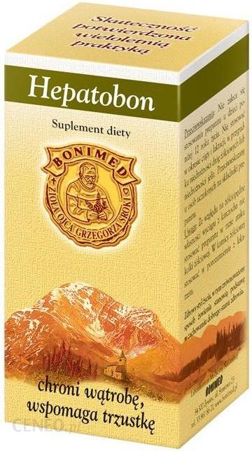 HepatobonChroni wątrobę, wspomaga trzustkęZe względu na zawartość liści karczocha i sylimaryny preparat ziołowy polecany jest jako uzupełnienie codziennej diety w składniki wspomagające proces trawienia, prawidłową pracę wątroby i trzustki oraz neutralizujące szkodliwy wpływ wolnych rodników na organizm. Ze względu na zawartość liści karczocha wspomaga prawidłową pracę pęcherzyka żółciowego i jelit oraz utrzymanie prawidłowego poziomu cholesterolu we krwi.Składniki:ekstrakt z karczocha, żelatyna, sylimaryna, substancja wypełniająca (maltodekstryna), substancje przeciwzbrylające (stearynian magnezu, dwutlenek krzemu).Zalecana do spożycia dzienna porcja produktu (3 kapsułki) zawiera:Ekstrakt z liści karczocha 702 mg. Sylimaryna 201 mg,Zalecane spożycie:Spożywać 1 kapsułkę 3 razy dziennie przed posiłkiem.Suplement diety nie może być stosowany jako substytut (zamiennik) zróżnicowanej diety. Nie przekraczać zalecanej porcji do spożycia w ciągu dnia.Przechowywanie:Przechowywać w zamkniętym opakowaniu w temp. poniżej 25 0C, w miejscu suchym i niedostępnym dla małych dzieci. Chronić przed promieniami słonecznymi.Przeciwwskazania:Nie zaleca się stosowanie preparatu u dzieci poniżej 12 roku życia. Nie stosować w okresie ciąży i laktacji, w przypadku niedrożności dróg żółciowych lub niedrożności jelit. Przeciwwskazany u osób uczulonych na składniki preparatu.Uwaga:Ze względu na żółciopędne własności wyciągu z karczocha nie stosować preparatu w razie ataku kolki żółciowej. W kamicy żółciowej stosować w porozumieniu z lekarzem.Zdrowy styl życia, w tym zrównoważony sposób żywienia stanowią podstawę w zachowaniu dobrego stanu zdrowia.Opakowanie:30 kapsułek.Producent:Laboratorium Medycyny Naturalnej BONIMED, ul. Stawowa 23, 34-300 Żywiec