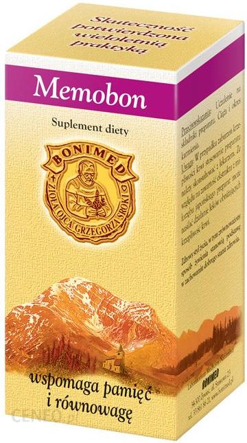 Suplement dietyPreparat polecany jest jako uzupełnienie codziennej diety w składniki wspomagające ukrwienie mózgu, pamieć, koncentrację oraz właściwe funkcjonowanie narządu słuchu i równowagi. Ze względu na zawartość korzenia żeń-szenia wspomaga witalność, wydolność fizyczną i psychiczną oraz utrzymanie prawidłowego poziomu glukozy we krwi. Dodatek magnezu przyczynia się do zmniejszenia uczucia zmęczenia, oraz prawidłowego funkcjonowania układu nerwowego i mięśniowego.Zastosowanie: uzupełnienie diety w składniki wspomagające pamięć i koncentracje.Zalecane spożycie: 1 kapsułka dziennie, rano.Składniki: mleczan magnezu, żelatyna, ekstrakt z liści miłorzębu japońskiego (ginko biloba L.), substancja wypełniająca (maltodekstryna), ekstrakt z korzenia żeń-szenia (Panax ginseng C.A. Meyer), substancje przeciwzbrylające (stearynian magnezu, dwutlenek krzemu).1 kapsułka zawiera: 70mg ekstraktu z liści miłorzębu japońskiego, 50mg ekstraktu z korzenia Żeń-szenia, 34mg magnezu (9%)** RWS – Referencyjna Wartość Spożycia.Przeciwwskazania: nie stosować w przypadku uczulenia na składniki preparatu, a także w okresie ciąży i karmienia piersią.Ważne wskazówki:Nie przekraczać zalecanej porcji do spożycia w ciągu dnia.Produkt nie może być stosowany jako substytut zróżnicowanej diety i zdrowego trybu życia.Zrównoważony sposób żywienia prawidłowy tryb życia jest ważny dla funkcjonowania organizmu człowieka.Preparat należy przechowywać w suchym miejscu, w temperaturze poniżej 25°C, w sposób niedostępny dla małych dzieci. Chronić przed promieniami słonecznymi.W przypadku zaburzenia krzepliwości krwi stosowanie preparatu należy skonsultować z lekarzem.Ze względu na zawartość ekstraktu z miłorzębu japońskiego preparat może nasilać działanie leków obniżających krzepliwość krwi.Producent:Laboratorium Medycyny Naturalnej BONIMED,ul. Stawowa 23,34-300 Żywiec