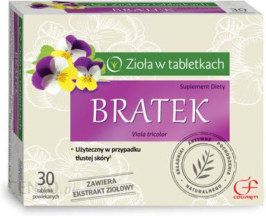 Suplement dietySuplement diety zawiera wyciąg z fiołka trójbarwnego (bratka), który sprzyja utrzymaniu zdrowej i pięknej skóry. Bratek dba o jej wygląd, eliminuje zanieczyszczenia i przyczynia się do jej korzystnego, ogólnego stanu.Zastosowanie: uzupełnienie diety w składniki pomagające utrzymać zdrową i piękną skórę.Zalecane spożycie: 1 tabletka 2 razy dziennie.Składniki: substancja wypełniająca: celuloza, wyciąg z ziela fiołka trójbarwnego, substancja przeciwzbrylająca: sole magnezowe kwasów tłuszczowych, substancja wypełniająca: sól sodowa karboksymetylocelulozy usieciowiona, substancja przeciwzbrylająca: dwutlenek krzemu, substancje glazurujące: sorbitole, kwasy tłuszczowe, guma arabska, karagen.1 tabletka zawiera: wyciąg z fiołka trójbarwnego w przeliczeniu na suszony bratek 600mg (zawartość wyciągu z fiołka trójbarwnego 100mg).Ważne wskazówki:Zawiera sorbitole.Suplement należy przechowywać w sposób niedostępny dla dzieci.Ważne jest stosowanie zbilansowanej i zróżnicowanej diety oraz prowadzenie zdrowego trybu życia.Preparat nie może być stosowany jako substytut zróżnicowanej diety.Nie należy przekraczać zalecanej porcji dziennej.Przechowywać w temperaturze pokojowej, w suchym miejscu.Producent:Zakłady Farmaceutyczne Colfarm S.A.ul. Wojska Polskiego 339 – 300 Mielec