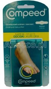 Plastry COMPEED na odciski między palcami stóp 10 sztukOpis:Compeed został wyprodukowany z prawie niewidocznego, miękkiego, żelowego materiału, który:zapewnia optymalną ochronę przed ocieraniem i uciskiemgłęboko nawilża i zmiękcza odcisk, aby delikatnie, ale skutecznie go usunąć.Natychmiastowa ulga w bólu i ucisku. W 100% naturalny sposób usuwania odcisków. Pozostaje na miejscu do 3 dni. Szczegółowa instrukcja użycia wewnątrz opakowaniaW przypadku cukrzycy, przed zastosowaniem, należy skonsultować się z lekarzem.Przed użyciem zapoznaj się z ulotką, która zawiera wskazania, przeciwwskazania, dane dotyczące działań niepożądanych i dawkowanie oraz informacje dotyczące stosowania produktu leczniczego, bądź skonsultuj się z lekarzem lub farmaceutą.Opakowanie:10 sztuk