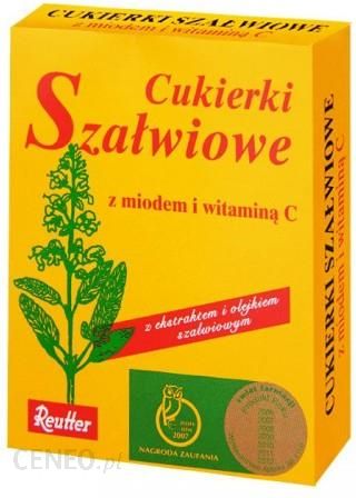 RODZAJ REJESTRACJI: suplement dietyPRODUCENT: REUTTER GMBHILOŚĆ: 50gCukierki szałwiowe z miodem i witaminą C.ZASTOSOWANIE:Szałwia i witamina C pomaga w prawidłowym funkcjonowaniu układu odpornościowego organizmu.ZALECANA PORCJA DO SPOŻYCIA:Wartość odżywcza: 100 gWartość energetyczna 385 kcal (1636 kJ)Białko 0 gWęglowodany 96 g, w tym: cukry 67 gTłuszcz 0 g, w tym: kwasy tłuszczowe nasycone 0 gBłonnik 0 gSód 0 gWitamina C 500 mg (625%)** – % zalecanego dziennego spożyciaSKŁAD:Cukier, syrop glukozowy, miód, ekstrakt szałwiowy (2%), kwas L-askorbinowy (witamina C), kwas winowy – regulator kwasowości, syrop karmelowy, olejek szałwiowy (0,15%), mentol.Przechowywanie: w zamkniętym opakowaniu, w suchym miejscu, w temperaturze 15-25 st. Celsjusza, w sposób niedostępny dla małych dzieci. Chronić przed światłem.Ostrzeżenie: Nie przekraczać zalecanej porcji dziennej. Suplement diety nie może być stosowany jako substytut zróżnicowanej diety. Nie stosować w przypadku uczulenia na którykolwiek ze składników preparatu. Nie zaleca się stosowania preparatu u kobiet w ciąży i karmiących piersią. Dla zachowania prawidłowego stanu zdrowia duże znaczenie ma zbilansowana i zróżnicowania dieta oraz zdrowy tryb życia.Nie stosować w przypadku nadwrażliwości/alergii na którykolwiek ze składników preparatuPrzed użyciem zapoznaj się z treścią ulotki dołączonej do opakowania bądź skonsultuj się z lekarzem lub farmaceutą, gdyż każdy preparat niewłaściwie stosowany zagraża Twojemu życiu lub zdrowiu.