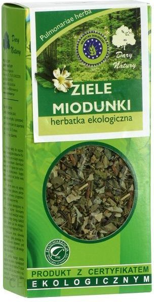 DARY NATURY MIODUNKA ZIELE 25GMiodunka ziele – herbatka ekologiczna Według literatury zielarskiej ziele miodunki zawiera dużo rozpuszczalnej krzemionki, garbniki, flawonoidy, kwasy organiczne i sole mineralne. Miodunka jest nazywana płucnikiem lub zielem płucnym ze względu na bardzo korzystne działanie na płuca. Najważniejszym składnikiem jest rozpuszczalna krzemionka, która stosowana jest w celu zapobiegania zmianom jakie zachodzą w organizmie wraz z wiekiem.Działanie prozdrowotne:działa wykrztuśnie, dlatego może wspomagać leczenie infekcji górnych dróg oddechowych, zmniejsza ryzyko krwotoków i wysięków, wzmacnia organizm, wykazuje działanie moczopędne, stosowana w leczeniu nieżytu i zakażeń układu oddechowego.Sposób użycia: Ziele miodunki zalać szklanką wrzątku, odstawić na 10-15 minut. Pić 1-2 razy dziennie.Składniki: ziele miodunki 100%Opakowanie: 25g