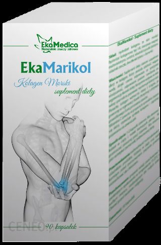 EkaMarikol, kolagen morski, EkaMedica, 90 kapsułek – opis produktuEkaMarikol to suplement diety uzupełniający dietę w kolagen posiadający zdolność wiązania wody w tkankach. Prawidłowa struktura kolagenu odpowiada za sprężystość, elastyczność, odpowiedni poziom nawilżenia oraz stan zdrowej skóry. Kolagen to podstawowe białko tkanki łącznej i składnik fibrylarny skóry, kości i ścięgien.Zastosowanie: suplementacja diety w składniki aktywne preparatu.Zalecane spożycie: 1 do 2 kapsułki dziennie.Składniki: hydrolizat kolagenu ze skór ryb morskich, substancja przeciwzbrylająca: dwutlenek krzemu, otoczka kapsułki (żelatyna, barwnik: dwutlenek tytanu).1 kapsułka zawiera: hydrolizat kolagenu ze skór ryb morskich 450mg.2 kapsułki zawierają: hydrolizat kolagenu ze skór ryb morskich 900mg.Przeciwwskazania: nadwrażliwość na którykolwiek ze składników produktu.Ważne wskazówki:Nie należy przekraczać zalecanej dziennej porcji.Zrównoważony sposób żywienia i prawidłowy tryb życia jest ważny dla funkcjonowania organizmu człowieka.Suplement diety nie może być stosowany jako substytut (zamiennik) zróżnicowanej diety.Kobiety w ciąży oraz w okresie karmienia przed zastosowaniem preparatu powinny skonsultować się z lekarzem.Przechowywać w zamkniętym opakowaniu, w temperaturze pokojowej, w suchym miejscu, w sposób niedostępny dla małych dzieci.Chronić przed światłem i wilgocią.Producent:EkaMedica Sp. z o.o. Sp. k.,ul. Bielska 78a,43-340 Kozy.