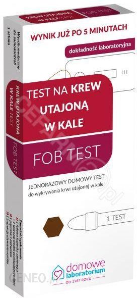 Test FOB Certain do wykrywania krwi utajonej w kale, 1 sztukaFOB Test jest domowym testem do wykrywania krwi utajonej w kale. Wynik Testu FOB otrzymujemy w czasie od 5 do 8 minut. Obecność krwi w kale towarzyszy wielu schorzeniom, np. hemoroidom, krwi w moczu, chorobom żołądka. Otrzymanie dodatniego wyniku testu nie oznacza, że osoba, której kał był badany, ma raka jelita grubego. Jednak w przypadku wyniku dodatniego – osoba, której badanie dotyczyło, powinna skonsultować się z lekarzem rodzinnym, chirurgiem-onkologiem, onkologiem, gastroenterologiem lub proktologiem.Wskazania: wykrywanie krwi utajonej w kale.Stosowanie:Pobieranie próbki kału:Weź do ręki pojemnik do pobierania próbek kału w taki sposób, aby niebieska nakrętka była na górze, a biała na dole. Odkręć niebieską nakrętkę i za pomocą aplikatora umieszczonego w tej nakrętce pobierz próbkę kału do badania.Aby pobrać próbkę do badania, należy „wkręcić” końcówkę aplikatora w trzy różne miejsca badanego kału na głębokość ok. 1 cm. Należy przy tym zwrócić uwagę, aby kał pokrywał powierzchnię aplikatora tylko cienką warstwą. Uwaga: Zbyt duża ilość kału na aplikatorze, wprowadzona później do pojemnika z roztworem, może dać nieważny wynik testu.Aplikator z pobraną w powyższy sposób próbką kału wprowadź z powrotem do pojemnika z roztworem ekstrakcyjnym, szczelnie zakręć i energicznie potrząśnij w celu dokładnego wymieszania.Wykonanie badania:Wyjmij płytkę testową z aluminiowej kopertki i umieść ją na poziomej powierzchni. W kopertce znajduje się również środek pochłaniający wilgoć, który należy wyrzucić do domowych śmieci. Badanie powinno być wykonane w ciągu godziny.Trzymając pojemnik do pobierania próbek tak jak poprzednio (niebieska nakrętka na górze, biała na dole), odkręć tym razem białą nakrętkę, która zabezpiecza końcówkę pojemnika przed przypadkowym odłamaniem.Energicznie potrząśnij pojemnikiem, aby dokładnie wymieszać próbkę kału z płynem. Następnie chwytając przez chusteczkę higieniczną za końcówkę pojemnika, odłam ją.Ściskając ścianki pojemnika nakropl 3 pełne krople roztworu do okrągłego okienka na płytce testowej. W czasie nakraplania nie dotykaj końcówką do płytki testowej.Zacznij odmierzać czas.Odczytaj wynik testu po 5 minutach. Nie bierz pod uwagę wyniku otrzymanego po czasie dłuższym niż 10 minut. Pozostałą w pojemniku na próbki resztę płynu wylej do toalety i spłucz wodą. Po odczytaniu wyniku, test i pusty pojemnik wyrzuć do domowych śmieci.Interpretacja wyników:Wynik ujemny W okienku wynikowym pojawia się tylko jedna linia: prążek kontrolny C. Prążek testowy T nie pojawia się. W badanej próbce nie wykryto krwi utajonej.Wynik dodatni W okienku wynikowym pojawiają się dwa zabarwione na różowo prążki: kontrolny C i testowy T. Intensywność zabarwienia prążka testowego T nie ma znaczenia. Prążek testowy T może być słabszy, taki sam lub silniejszy niż prążek kontrolny C. Nawet bardzo słaby prążek T należy interpretować jako dodatni wynik testu. W badanej próbce kału wykryto krew utajoną.Wynik nieważny W okienku wynikowym nie pojawia się żadna linia lub pojawia się tylko linia testowa T. W takim przypadku nie ma możliwości interpretacji wyniku testu i badanie należy powtórzyć z nowej próbki kału i używając nowego testu.Zestaw zawiera:- przyrząd Certain FOB test,- butelka z czerwoną nakrętką zawierającą niewielką ilość płynu,- jednorazowa plastikowa pipeta,- patyczek do pobierania próbek (wewnątrz butelki), torebka z żelem krzemionkowym pochłaniająca wilgoć.