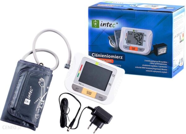 Ciśnieniomierz Intec, U80LH, automatyczny, natramienny z zasilaczem – opis produktuAutomatyczny, naramienny ciśnieniomierz z zasilaczem.Cechy produktu:- wykrywanie arytmii,- funkcja czasu,- sygnał dźwiękowy,- pamięć dla 2 użytkowników,- średnia z 3 ostatnich pomiarów,- szeroki zakres mankietu 22-32cm.Specyfikacja techniczna:- wyświetlacz: LCD, cyfrowy,- metoda pomiaru: oscylometryczna,- miejsce pomiaru: ramię,- pomiar, zakres: ciśnienie 0-299mmHg; tętno 40-199 impulsów/min;- precyzja pomiaru: ciśnienie +/-3mmHg; tętno +/-5% odczytu,- wskazanie LCD: ciśnienie: 3 cyfry mmHg, tętno: 3 cyfry, symbol: pamięć/bicie serca/wyczerpana bateria,- funkcja pamięci: 2×90 wyników,- źródło zasilania: zasilacz sieciowy lub 4 x bateria alkaiczna AA,- automatyczne wyłączenie: po 3 minutach,.- ciężar głównej jednostki: ok. 250g (bez baterii),- wymiary głównej jednostki: dł.132 x szer. 100 x wys. 45mm,- ilość pomiarów: 10000 razy przy normalnym użytkowaniu,- orientacyjny czas pracy przy zasilaniu bateriami: do 300 pomiarów w standardowych warunkach,- akcesoria: mankiet, instrukcja obsługi.Zestaw zawiera:- aparat do mierzenia ciśnienia,- mankiet M, zakres obwodu 22-32cm,- instrukcja obsługi,- zasilacz.Gwarancja: 24 miesiące od daty sprzedaży. gwarancją nie są objęte: części ulegające naturalnemu zużyciu; uszkodzenia mechaniczne, termiczne i chemiczne sprzętu spowodowane przez użytkownika; uszkodzenia i wady wynikłe na skutek: niewłaściwego lub niezgodnego z instrukcją użytkowania, konserwacji lub przechowywania; niewłaściwej lub niezgodnej z instrukcją instalacji; używania materiałów eksploatacyjnych i akcesoriów innych niż zalecane przez gwaranta; samowolnych, dokonywanych przez użytkownika lub inne osoby napraw, przeróbek i zmian konstrukcyjnych; działania siły wyższej (powódź, pożar, uderzenie pioruna); usterki spowodowane niewłaściwym czyszczeniem sprzętu lub zaniechaniem tej czynności.