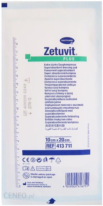 Zastosowanie: do zaopatrywania ran zarówno ostrych jak i chronicznych. W przypadku ran zakażonych lub zagrożonych zakażeniem opatrunek Zetuvit Plus można stosować w kombinacji z opatrunkiem Atrauman Ag. W przypadku ran silnie sączących i szczelinowych lub tworzących kieszonki, opatrunek Zetuvit Plus można stosować w połączeniu z opatrunkiem Sorbalgon.Charakterystyka:Zetuvit Plus, czterowarstwowy opatrunek o niezwykle wysokiej chłonności to doskonałe rozwiązanie do stosowania w przypadku silnie sączących ran. Dwuwarstwowa, zewnętrzna włóknina otacza cały opatrunek. Zewnętrzna warstwa włókniny, o właściwościach hydrofobowych, zapobiega przyleganiu opatrunku do rany. Warstwa wewnętrzna, z włókien celulozowych, ma właściwości hydrofilowe, co umożliwia szybkie przemieszczanie się wysięku do warstwy chłonnej. Warstwa chłonna zawiera pulpę celulozową oraz superabsorbent o bardzo wysokich właściwościach wchłaniania. Wysięk zostaje związany i zamknięty w strukturze warstwy chłonnej. Miękkość warstwy chłonnej nadaje jej dodatkowo właściwości wyściełające. Warstwa chłonna otoczona jest cienką włókniną, która równomiernie rozprowadza wysięk na całej jej powierzchni. Na stronie przeciwległej do rany opatrunek wyposażony jest w specjalną włókninę przepuszczającą powietrze, ale nie przepuszczającą płynów, która zapobiega przenikaniu wydzieliny na zewnątrz oraz chroni przed zabrudzeniem.