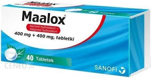 Skład:1 tabletka zawiera:wodorotlenek glinu – 400 mgwodorotlenek magnezu – 400 mgDziałanie:Maalox jest lekiem złożonym, o miejscowym działaniu zobojętniającym nadmiar kwasu solnego soku żołądkowego, ściągającym i osłaniającym błonę śluzową żołądka i dwunastnicy. Nie powoduje nadmiernego zobojętniania treści żołądka i wtórnego pobudzenia wydzielania kwasu.Wskazania:Maalox jest wskazany w leczeniu objawowym zaburzeń ze strony górnego odcinka przewodu pokarmowego, związanych z nadkwaśnością:-nieżyt żołądka,-zarzucanie wsteczne treści żołądka do przełyku w przebiegu przepukliny rozworu przełykowego przepony,-niestrawność, zgaga z powodu nadkwaśności,oraz pomocniczo w leczeniu:-choroby wrzodowej dwunastnicy,-choroby wrzodowej żołądka.Przeciwwskazania-nadwrażliwość na wodorotlenek glinu, wodorotlenek magnezu lub którykolwiek składnik leku,-ciężka niewydolność nerek.Dawkowanie1-2 tabletki po posiłku lub w czasie bólu.Tabletki należy ssać lub żuć.Dawkę i częstotliwość stosowania leku ustala lekarz prowadzący.Najczęściej lek stosuje się co 6 lub co 8 godzin, 1-2 godziny po posiłku i przed snem.Działania niepożądane:Bardzo rzadko mogą wystąpić: zaparcia, biegunki, nudności, wymioty, jasne zabarwienie stolca.