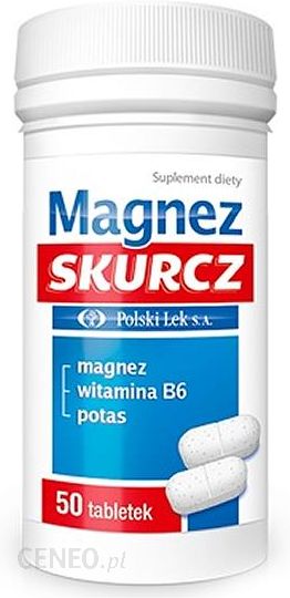 Nazwa międzynarodowa: -Postać: tabl.Dawka: -Opakowanie: 50 tabl.Magnez SKURCZ – suplement diety zawierający:magnezwitaminę B6potasSkładnikisubstancje wypełniające (celuloza mikrokrystaliczna, sorbitol), chlorek potasu, węglan magnezu, substancje przeciwzbrylające (glikol polietylenowy, poliwinylopirolidon), chlorowodorek pirydoksyny.Składniki2 tabletki Magnez 100 mg (27%)Potas 300 mg (15%)Witamina B6 1,4 mg (100%)Masa netto50 gWłaściwości składnikówWitamina B6 – wspomaga funkcjonowanie układu nerwowegoMagnez – zmniejsza zmęczenie, bierze udział w prawidłowym przebiegu funkcji psychologicznychPotas – utrzymuje prawidłowe funkcjonowanie nerwów i mięśni.Zalecane dzienne spożycie2 tabletki dziennie.Ostrzeżenia dotyczące bezpieczeństwaNie należy przekraczać zalecanej dziennej porcji.Zrównoważony sposób żywienia i prawidłowy tryb życia jest ważny dla funkcjonowania organizmu człowieka.Suplement diety nie może być stosowany jak substytut (zamiennik) zróżnicowanej diety.Przechowywać w temperaturze pokojowej.Suplementy diety powinny być przechowywane w sposób niedostępny dla małych dzieci.Chronić od wilgoci i światła.