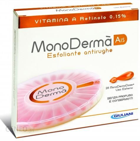 MONODERMA A15 – 0,15% czystego retinoluZadania: Odmłodzenie Odnowa komórkowa dla skóry dojrzałej Terapia przeciwtradzikowa, łojotok Monodermà A15 włoskiej firmy Giuliani stopniowo i skutecznie odmładza skórę dojrzałą, a poprzez zintensyfikowanie odnowy komórkowej i regeneracji skóry doskonale ją wygładza. Dzięki swojemu wielokierunkowemu działaniu wskazana jest także w terapii przeciwtrądzikowej, przy łojotoku a także nadmiernym rogowaceniu. UNIKALNA FORMUŁA! Czysta, skoncentrowana witamina A (retinol) w formie 28-dniowej kuracji Wygodna postać kapsułek MonoDermoDose® do pojedynczej aplikacji na skórę Ograniczony, naturalny skład by eliminować ryzyko podrażnień i alergii Nie zawiera konserwantów, sztucznych barwników i środków zapachowych Gwarantuje doskonałą przyswajalność i tolerancję Wskazania: terapia przeciwstarzeniowa dla cery dojrzałej wspomaga terapię przeciwtrądzikową łojotokowe zapalenie skóry rogowacenie skóry cellulit i niewielkie rozstępy Działanie: wspomaga regenerację komórkową wygładza głębsze zmarszczki delikatne działanie złuszczające stymuluje produkcję kolagenu i elastyny reguluje wydzielanie sebum i zmniejsza pory Częstotliwość: 1 dziennie Codzienne stosowanie witamin u osób młodych zapobiega utracie kolagenu i elastyny, czyli powstawaniu zmarszczek. U osób dojrzałych stymuluje syntezę tych związków, spowalniając proces starzenia skóry i wygładzając ją. Zalecane kuracje domowe: Witaminy Monodermà mogą być stosowana zarówno indywidualnie, zgodnie z wyżej opisanymi wskazaniami, lub w terapii łączonej z innymi witaminami Monodermà, bardziej ukierunkowanej na konkretne potrzeby skóry. Monoderma E5+ Monoderma A15 Wskazania: Terapia przeciwstarzeniowa dla skóry dojrzałej. Fotostarzenie skóry. Skóra odwodniona. Skóra sucha i cienka. Stosowanie: witamina E5 rano, witamina A15 wieczorem.Monoderma C10 + Monoderma E5 Wskazania: Terapia przeciwstarzeniowa dla skóry normalnej. Przebarwienia. Skóra wrażliwa. Zapobieganie foto-uszkodzeniom skóry. Po zabiegach medycyny estetycznej (peeling, laser). Stosowanie: witamina C10 rano, witamina E5 wieczorem.Monoderma C10 + Monoderma A15 Wskazania: Terapia przeciwstarzeniowa dla skóry mieszanej. Przebarwienia, piegi. Fotostarzenie skóry. Skóra ze skłonnością do trądziku. Stosowanie: witamina C10 rano, witamina A15 wieczorem.