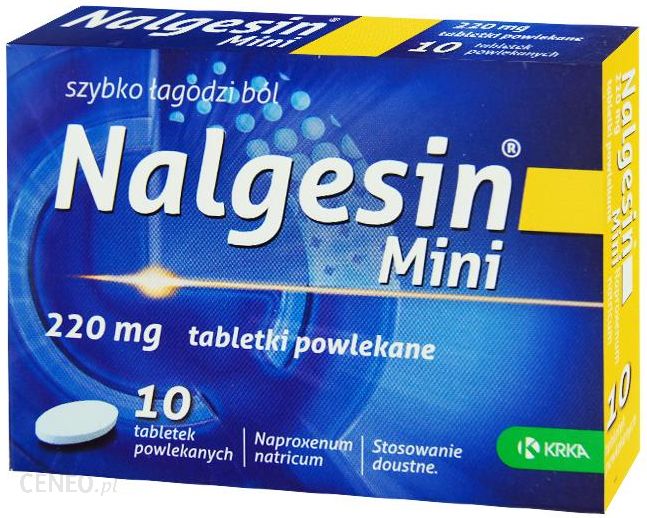Nalgesin Mini jest lekiem łagodzącym ból, zmniejszają cym stan zapalny.WskazaniaNalgesin Mini jest wskazany w krótkotrwałym leczeniu dolegliwości bólowych o małym i umiarkowanym nasileniu, takich jak: ból głowy, ból zęba, bolesne miesiączkowanie, bóle stawowe, bóle mięśniowe.Przeciwwskazania- jeśli pacjent jest uczulony na naproksen sodowy lub którykolwiek z pozostałych składników tego leku- jeśli u pacjenta występowały trudności z oddychaniem (astma oskrzelowa), pokrzywka lub zapalenie błony śluzowej nosa, polipy nosa lub poważne reakcje alergiczne które powodują trudności w oddychaniu lub zawroty głowy po zastosowaniu kwasu acetylosalicylowego orazinnych niesteroidowych leków przeciwzapalnych (NLPZ),- jeśli pacjent ma lub miał wrzód lub krwawienie w żołądku lub je litach;- jeśli u pacjenta występowało krwawienie lub perforacja w obrębie przewodu pokarmowego poza stosowaniu NLPZ;- jeśli u pacjenta występują ciężkie zaburzenia czynności wątroby lub nerek;- jeśli pacjent ma ciężką niewydolność serca;- podczas ostatnich trzech miesięcy ciąży;- jeśli u pacjenta występuje krwawienie naczyniowo- mózgowe lub inne czynne krwawienia.Działania niepożądane- nudności, niestrawność, zgaga, wymioty, ból w żołądku, wzdęcia, ból brzucha, niepokój- bóle głowy, zawroty głowy, senność,- zaburzenia snu, pobudzenie,- zaburzenia widzenia,- siniaki,- biegunka, zaparcia- wysypka skórna, świąd, pokrzywka,- zaburzenie czynności nerek,- dreszcze,- obrzęk kostek, stóp lub palców dłoniPrzyjmowanieZalecana dawka dla osób dorosłych i młodzieży w wieku powyżej 16 lat:1 tabletka na dobę, co 8 – 12 godzin.Tabletki należy połykać popijając odpowiednią ilością płynu, w czasie lubpo posiłku.SkładnikiSubstancją czynną leku jest naproksen sodowy.Każda tabletka zawiera 220 mg naproxenu sodowego, co odpowiada 200 mg naproksenu.Pozostałe składniki leku to: w rdzeniu tabletki: powidon K30, celuloza mikrokrystaliczna, talk, magnezu stearynian oraz w otoczce tabletki opadryYS-1R-4215, E 132 o składzie: hypromeloza, tytanu dwutlenek (E 171), makrogol 8000 i indygotyna (E 132), hypromeloza 6cp, makrogol 8000, candurin silver lustre o składzie: tytanu dwutlenek (E 171), krzemian glinowo-potasowy (E 555)