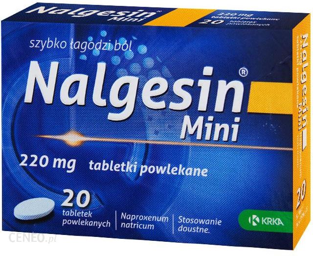 Nalgesin Mini 220mg, 20 tabletek Działanie: przeciwbólowe, przeciwzapalne, przeciwgorączkowe, .Wskazania: Nalgesin Mini stosowany stosowany w krótkotrwałym leczeniu dolegliwości bólowych o małym i umiarkowanym nasileniu, takich jak: ból głowy, ból zęba, bolesne miesiączkowanie, bóle stawowe, bóle mięśniowe.Skład: substancją czynną leku jest naproksen sodowy. Każda tabletka zawiera 220mg naproxenu sodowego, co odpowiada 200mg naproksenu; pozostałe składniki leku to: w rdzeniu tabletki: powidon K 30, celuloza mikrokrystaliczna, talk, magnezu stearynian oraz w otoczce tabletki opadry YS-1R-4215, E 132 o składzie: hypromeloza, tytanu dwutlenek (E171), makrogol 8000 i indygotyna (E 132), hypromeloza 6cp, makrogol 8000, candurin silver lustre o składzie: tytanu dwutlenek (E171), krzemian glinowo-potasowy (E 555).Stosowanie: zalecana dawka dla osób dorosłych i młodzieży w wieku powyżej 16 lat z wagą powyżej 50 kg to 1 tabletka na dobę, co 8-12 godzin; alternatywnie, można przyjąć dwie tabletki od razu i w razie potrzeby jedną dodatkową tabletkę po 8-12 godzinach.Tabletki należy połykać popijając odpowiednią ilością płynu, w czasie lub po posiłku. U pacjentów z nadwrażliwością żołądka, korzystne jest stosowanie leku w czasie posiłku. Tabletek nie należy rozgryzać. Maksymalna dobowa dawka to 3 tabletki (co odpowiada 660mg naproksenu sodowego). Przeciwwskazania: nie stosować leku, jeśli: pacjent jest uczulony na naproksen sodowy lub którykolwiek z pozostałych składników tego leku (wymienionych w punkcie 6); jeśli u pacjenta występowały trudności z oddychaniem (astma oskrzelowa), pokrzywka lub zapalenie błony śluzowej nosa, polipy nosa lub poważne reakcje alergiczne które powodują trudności w oddychaniu lub zawroty głowy po zastosowaniu kwasu acetylosalicylowego oraz innych niesteroidowych leków przeciwzapalnych (NLPZ); jeśli pacjent ma lub miał wrzód lub krwawienie w żołądku lub jelitach; jeśli u pacjenta występowało krwawienie lub perforacja w obrębie przewodu pokarmowego po zastosowaniu NLPZ; jeśli u pacjenta występują ciężkie zaburzenia czynności wątroby lub nerek; jeśli pacjent ma ciężką niewydolność serca; podczas ostatnich trzech miesięcy ciąży; – jeśli u pacjenta występuje krwawienie naczyniowo-mózgowe lub inne czynne krwawienia; nie podawać dzieciom w wieku poniżej 2 lat.