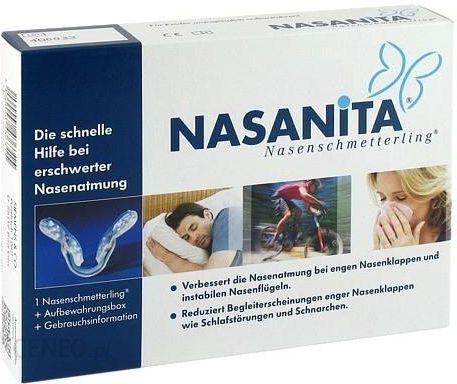 Zastosowanie Nasanita motylek do nosa (Opakowanie: 1 szt.)Nasanita motylek do nosa (Opakowanie: 1 szt.) pomaga tam, gdzie pojawia się problem.Wiele osób cierpi z powodu zaburzeń oddychania – z powodu problemów z przegrodą nosową lub skrzydełkami nosa. W takich przypadkach pomoże ci Nasanita motylek do nosa (Opakowanie: 1 szt.) – po prostu wsadź produkt do nosa, a elastyczny silikon dopasuje się do jego kształtu i ustabilizuje skrzydełka nosa od wewnątrz.Od razu nastąpi poprawa w oddychaniu przez nos. Motylek sprawi, że większa ilość powietrza będzie mogła być wdychana.Efekt działania Nasanita motylek do nosa (Opakowanie: 1 szt.) bezpieczny oraz łatwy w aplikacji może być stosowany przez alergików – wysoka kompatybilność ergonomiczny – dopasuje się do kształtu każdego nosa produkt wielokrotnego użytku (może być noszony co najmniej 6 miesięcy Problemy z oddychaniem dotyczą wielu osób. Niestety często powodem jest kształt nosa, problemy z przegrodą itp. Oddychanie przez usta nie zapewni takiego filtrowania powietrza jak oddychanie przez nos. Na dodatek może prowadzić do podrażnienia błony śluzowej gardła, krtani i oskrzeli, a także prowadzić do zwiększonej ilości infekcji. W nocy zaś trudności z oddychaniem mogą być częściowo odpowiedzialne za chrapanie.Sposób użyciaWystarczy jeden ruch aby założyć motylek – i to ty decydujesz jak długo chcesz go nosić. Nasanita motylek do nosa (Opakowanie: 1 szt.) składa się z wysokiej czystości i jakości materiałów, w związku z tym nie ma przeciwwskazań do długotrwałego noszenia produktu. Przed i po każdym użyciu należy przepłukać produkt w ciepłej wodzie. Produkt po wyschnięciu jest gotowy do użycia.Dodatkowe informacjePrzy problemach z oddychaniem.Nasanita motylek do nosa (Opakowanie: 1 szt.) możecie kupić na stronie apteki internetowej www.apodiscounter.pl.