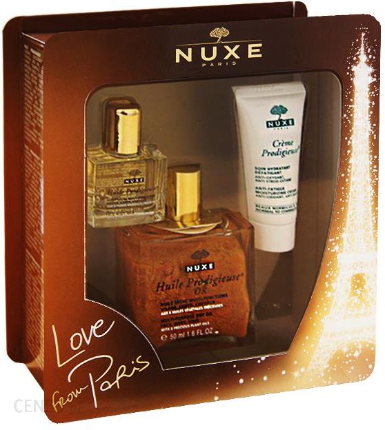 NUXE Prodigieuse OR, olejek z drobinkami złota, 50ml:Suchy olejek o wielu zastosowaniach przeznaczony dla każdego rodzaju skóry i włosów. Olejku Prodigieuse OR zawiera złote drobinki, stanowiące kompozycję wspaniale podkreślającą opaleniznę i rozświetlającą skórę. Olejek łączy w sobie zalety wszechstronnej pielęgnacji: nawilża, intensywnie odżywia, odnawia i chroni. Najnowsza formuła zawiera 2 nowe olejki: z orzechów makadamii i laskowych oraz kompozycję 3 roślinnych estrów. Błyskawicznie się wchłania, pozostawiając skórę miękką i satynowo gładką, a włosy jedwabiste i błyszczące.Sposób użycia: nałóż suchy olejek z drobinkami złota na twarz, ciało czy włosy. Stosuj przez cały rok, zarówno w lecie, jak i w zimie. Idealny kosmetyk po opalaniu – nadaje niepowtarzalny odcień i blask opalonej skórze. Wetrzyj nieco olejku we włosy, aby uzyskać złociste refleksy na fryzurze. Rozmasuj suchy olejek z drobinkami złota na nogach od dołu do góry – tym samym nadasz im jedwabisty połysk. Satynowy odblask i perłowe refleksy delikatnie korygują niedoskonałości skóry.Zawiera 95% składników pochodzenia naturalnego. Nie zawiera parabenów.NUXE Prodigieuse, krem Prodigieuse, 15ml:Nawilżający i usuwający oznaki zmęczenia krem na dzień. Chroni skórę przed stresem oksydacyjnym. Zalecany do pielęgnacji skóry normalnej i mieszanej.Sposób użycia: nakładaj krem na idealnie oczyszczoną twarz i szyję, delikatnie wmasuj.NUXE Prodigieuse OR, olejek suchy, 10ml:Ten suchy olejek o zawartości 97,8% składników pochodzenia naturalnego to nowatorskie połączenie 30% szlachetnych olejków roślinnych i witaminy E. Zawiera wysokie stężenie 6 szlachetnych olejków roślinnych (z ogórecznika, dziurawca, słodkich migdałów, kamelii, orzechów laskowych i orzechów makadamia) oraz witaminę E. Tak skomponowana formuła odżywia, odnawia wygładza skórę twarzy i ciała oraz włosy. Ten prosty w stosowaniu preparat do całościowej pielęgnacji, szybko się wchłania, pozostawiając gładką i jedwabistą skórę oraz błyszczące, miękkie włosySposób użycia: nałóż suchy olejek na twarz, ciało i włosy. Stosuj przez cały rok, zarówno w lecie, jak i w zimie. Wymieszaj kroplę olejku Huile Prodigieuse z podkładem, dzięki temu delikatnie rozprowadzisz go bez rozmazywania. Rozpyl nieco suchego olejku w zagłębieniu dłoni, a następnie delikatnie wetrzyj we włosy – fryzura nabierze naturalnego wyglądu. Kilka kropli olejku Huile Prodigieuse dodanych do kąpieli uczyni skórę miękką i gładką.Zawiera 97,8% składników pochodzenia naturalnego. Nie zawiera parabenów.