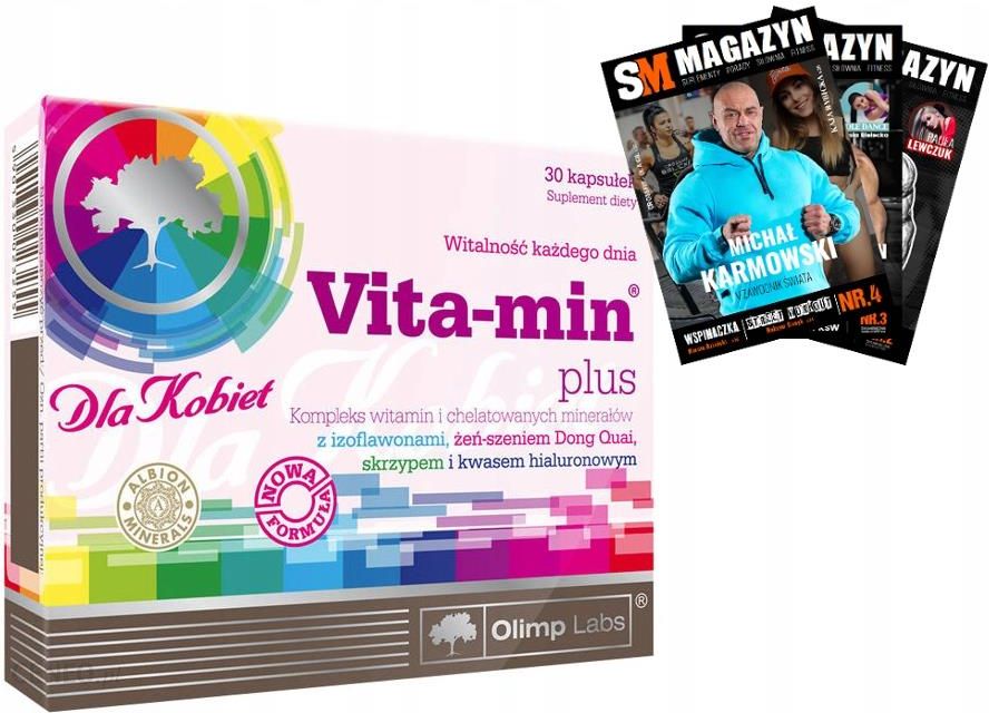 OLIMP VITA-MIN PLUS DLA KOBIET 30 KAPSUŁEKNatłok pracy, brak zbilansowanej diety bogatej w makroskładniki i wartościowe mikroelementy w końcu odbiją się na Twoim codziennym funkcjonowaniu. Sięgnij po Vita-Min Plus Dla Kobiet – suplement diety od firmy Olimp pozwalający w łatwy i szybki uzupełnić niedobory cennych witamin i minerałów.Vita-Min Plus Dla Kobiet stanowi kompleks witamin i składników mineralnych w postaci wysoko przyswajalnych oraz bezpiecznych w stosowaniu chelatów aminokwasowych Albion®. Suplement diety wzbogacono dodatkowo kwasem hialuronowym oraz naturalnymi ekstraktami: izoflawonów sojowych, żeń-szenia Dong Quai, skrzypu polnego i pieprzu czarnego.Wspomniany kwas hialuronowy korzystnie wpływa na jędrność i nawilżenie skóry. Do jego produkcji przyczyniają się m.in. izoflawony sojowe, które są silnymi antyoksydantami. Pozytywnie oddziałują też na skórę, m.in. dbając o odpowiednie dotlenienie jej komórek, sprzyjają poprawieniu gęstości skóry oraz wykazują działanie przeciwzapalne.O układ odpornościowy, poprawę pracy układu krążenia, tonizację organizmu zadba z kolei ekstrakt z żeń-szenia Dong Quai. Dodatek skrzypu polnego natomiast pozytywnie wpływa na wygląd skóry, paznokci i włosów. Ponadto stanowi on wartościowe wsparcie dla właściwej pracy dróg moczowych. Jest jeszcze pieprz czarny wspomagający m.in. trawienie i wchłanianie składników odżywczych.Vita-Min Plus Dla Kobiet to bezpieczny w stosowaniu suplement diety, o czym świadczy jego produkcja w warunkach farmaceutycznych. Nowatorska technologia oraz bogata wiedza specjalistów Olimp Laboratories pozwoliły stworzyć preparat w formie łatwych do połknięcia kapsułek wolny od jakichkolwiek zanieczyszczeń i metali ciężkich, zawierający szereg istotnych dla prawidłowego funkcjonowania organizmu mikroelementów. Należy pamiętać, że suplement nie może być traktowany jako zamiennik zbilansowanej diety, a jedynie jako jej cenny dodatek.