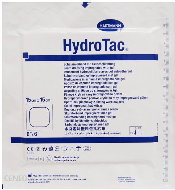 Zastosowanie:Do zaopatrywania ran trudno gojących się, zarówno sączących jak i relatywnie suchych,w fazie ziarninowania i epitelializacji doskonale nadaje się do stosowania w połączeniuz terapią kompresyjną w przypadkach owrzodzeń podudzi pochodzenia żylnego.Charakterystyka:HydroTac® jest kombinacją opatrunku piankowego z hydrożelem.Podstawą opatrunku jest pianka poliuretanowa.Warstwę opatrunku od strony rany stanowi hydrożel.Warstwa hydrożelu ma postać siatki, co pozwala na swobodne przejście wysięku do chłonnej warstwy piankowej.Pianka poliuretanowa szybko wchłania nadmiar wysięku rany i zamyka go w swojej strukturze. Nie oddaje go nawet pod wpływem terapii uciskowej.Hydrożel uwalnia wilgoć do rany utrzymując w niej wilgotne środowisko, sprzyjające ziarninowaniu i odbudowie nabłonka.Hydrożel zapobiega przyklejaniu się opatrunku do rany. Zmiany opatrunku przebiegają bezboleśnie.Warstwa hydrożelu daje opatrunkowi efekt początkowej przylepności „Initial Tack”.Dzięki temu zakładanie opatrunku staje się dużo prostsze.Od strony zewnętrznej opatrunek pokryty jest wodoodporną folią poliuretanową, chroni ranę przed wnikaniem drobnoustrojów chorobotwórczych, nie utrudnia jednak przepływu powierza i pary wodnej.