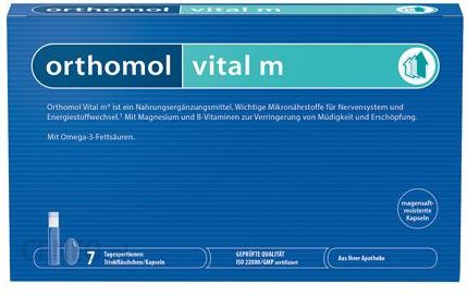 Zastosowanie Orthomol Vital M ampułka+2x kapsułka (Opakowanie: 7 szt.)Orthomol Vital M ampułka+2x kapsułka (Opakowanie: 7 szt.) to specjalistyczny suplement diety stanowiący dietetyczne wsparcie dla mężczyzn cierpiących na przewlekłe zmęczenie, wypalenie, brak energii.Orthomol Vital M ampułka+2x kapsułka (Opakowanie: 7 szt.) zawiera wysoko skoncentrowaną kombinację witamin, minerałów oraz pierwiastków śladowych specjalne dostosowanych do potrzeb mężczyzn. wzmacnia organizm wspiera układ nerwowy i metabolizm energetyczny redukuje uczucie przewlekłego wyczerpania i zmęczenia chroni komórki przed stresem oksydacyjnym SkładDawka dzienna Orthomol Vital M ampułka+2x kapsułka (Opakowanie: 7 szt.) zawiera witamina A – 450 µg witamina C – 530 mg witamina E – 150 mg (alfa-TE) witamina B1 – 25 mg witamina B2 – 25 mg niacyna – 60 mg NE witamina B6 – 20 mg witamina B12 – 6 µg witamina K1 – 60 µg witamina D3 – 5 µg (200 I.E.) kwas foliowy – 800 µg kwas pantotenowy – 10 mg biotyna – 165 µg magnez – 100 mg selen – 50 µg cynk – 10 mg mangan – 10 mg miedź – 2 mg chrom – 30 µg molibden – 60 µg jod – 150 µgbiofawonoidy cytrusowe – 5 mg mieszanka karotenoidów – 20 mg(beta-karoten, luteina, likopen) nienasycone kwasy tłuszczowe Omega-3 – 340 mg wartość energetyczna – 162 kJ (38,6 kcal) białko – 0,4 g węglowodany – 6,1 g tłuszcze – 1 gŚrodki ostrożnościNie stosować w przypadku stwierdzonej nadwrażliwości na którykolwiek ze składników produktu.Sposób użyciaPrzyjmować codziennie zawartość jednej ampułki oraz 2 kapsułki (= dawka dzienna). Najlepiej spożyć w trakcie lub bezpośrednio po posiłku.Przed użyciem należnyDodatkowe informacjeProdukt nie zawiera laktozy i glutenu.Orthomol Vital M ampułka+2x kapsułka (Opakowanie: 7 szt.) możecie kupić na stronie apteki internetowej www.apodiscounter.pl.