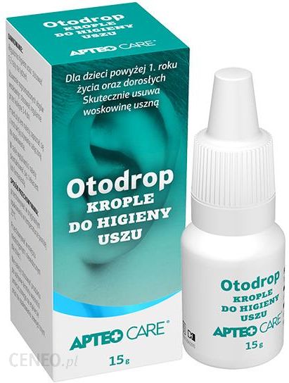 OTODROP krople do higieny uszu 15 g APTEO CAREOtodrop jest łagodnym preparatem przeznaczonym do higieny uszu, stosowanym w celu usuwania zalegającej woskowiny usznej oraz zapobiegającym jej ponownemu gromadzeniu się. Wyrób zawiera dokuzynian sodu, substancję przebadaną klinicznie1 , która skutecznie usuwa woskowinę uszną, szczególnie u dzieci2 , ekstrakt z aloesu, składnik pochodzenia naturalnego znany ze swych właściwości łagodzących oraz hialuronian sodu (kwas hialuronowy), odpowiadający za utrzymanie właściwego nawilżenia błon śluzowych ucha. Nie zawiera konserwantów, parabenów ani propelentówSposób użyciaRegularna higiena uszu: stosować 1-2 razy na tydzieńSkładDokuzynian sodu,nalewka z nagietka lekarskiego,gliceryna