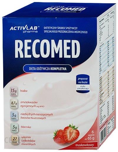 Dietetyczny środek spożywczy specjalnego przeznaczenia medycznegoŚrodek spożywczy kompletny pod względem odżywczym o składzie uwzględniającym zapotrzebowanie organizmu do odżywiania osób w okresie rekonwalescencji po chorobie, operacji, niedożywionych, wyniszczonych. RecoMed zawiera wszystkie niezbędne składniki odżywcze: białko, węglowodany, tłuszcz, błonnik pokarmowy oraz komplet witamin i składników mineralnych. Skoncentrowana forma produktu ułatwia podawanie i nie obciąża dodatkowo organizmu chorego. Białko obecne w produkcie to najwyższej jakości koncentrat białka serwatkowego.Zastosowanie: do postępowania dietetycznego w niedożywieniu związanym z chorobą np. nowotworową; u osób: przewlekle chorych, wymagających rekonwalescencji po operacjach chirurgicznych, w podeszłym wieku.Zalecane spożycie: RecoMed może być stosowany jako jedyne źródło pożywienia (6 porcji dziennie) lub jako uzupełnienie diety lub jej częściowe zastępowanie (1-3 porcje dziennie).Składniki: maltodekstryna, koncentrat białka serwetkowego, aminokwasy (L-walina, L-leucyna, chlorowodorek L-lizyny, L-fenyloalanina, L-izoleucyna, L-metionina, L-treonina), olej słonecznikowy, inulina, składniki mineralne (cytrynian potasu, ortofosforan wapnia, chlorek potasu, węglan magnezu, siarczan żelaza(II), siarczan cynku, siarczan miedzi(II), siarczan manganu, jodek potasu, selenian(IV) sodu, molibdenian(VI) sodu, chlorek chromu(III), aromaty, emulgator: difosforan disodowy, barwnik: koszenila naturalna, substancje zagęszczające: karboksymetyloceluloza, substancja przeciwzbrylająca: dwutlenek krzemu, regulator kwasowości: kwas cytrynowy, witaminy (kwas L-askorbinowy, amid kwasu nikotynowego, octan DL-alfa-tokoferylu, octan retinylu, cholekalcyferol, D-pantotenian wapnia, chlorowodorek pirydoksyny, ryboflawina, monoazotan tiaminy, kwasfoliowy, D-biotyna, filochinon, cyjamokobalamina), przeciwutleniacz: alfa-tokoferol, substancja słodząca:sukraloza.100g zawiera: wartość energetyczna 1632kJ/388kcal, białko 23,1g, węglowodany 49g (w tym cukry 0g), tłuszcz 9,2g (w tym kwasy tłuszczowe nasycone 1,5 g), błonnik 7,7 g, sód 0,32g. Składniki mineralne: potas 920mg, chlorki 368mg, wapń 368mg, fosfor 309mg, magnez 97mg, żelazo 6,4mg, cynk 4,6mg, mangan 0,9mg, miedź 0,5mg, jod 69µg, selen 25,3µg, molibden 23µg, chrom 18,4µg, fluorek 0,0mg. Witaminy: witamina A 368µg, witamina D 2,3µg, witamina E 12mg, witamina K 34,5µg, witamina C 37mg, witamina B1 0,5mg, witamina B2 0,6mg, niacyna 7,4mg, kwas pantotenowy 2,8mg, witamina B6 0,6mg, biotyna 23µg, kwas foliowy 92µg, witamina B12 1,15µg. Aminokwasy egzogenne: L-Leucyna 3000mg, L-Izoleucyna 1538mg, L-Walina 2000mg, L-Lizyna 2308mg, L-Tryptofan 308mg, L-Metionina+L-Cysteina 1154mg, L-Fenyloalanina + L-Tyrozyna 1923mg, L-Treonina 1154mg.Osmolarność roztworu: 490 mOsm/l.1 porcja (65g) zawiera: białka 24% kcal, węglowodany 51% kcal, tłuszcze 21% kcal, błonnik 4% kcal.Przeciwwskazania: uczulenie na którykolwiek ze składników produktu.Ważne wskazówki:Produkt przyjmowany pod nadzorem lekarza.Odpowiedni jako jedyne źródło pożywienia.Produkt nie jest przeznaczony do stosowania pozajelitowego.Nie stosować w przypadku nadwrażliwości na którykolwiek ze składników preparatu.Przechowywać w miejscu suchym, w temperaturze pokojowej, w szczelnie zamknięty opakowaniu, w sposób niedostępny dla dzieci.Nie należy przekraczać zalecanej porcji do spożycia w ciągu dnia.Utrzymanie prawidłowego stanu zdrowia wymaga zrównoważonego odżywiania i prowadzenia zdrowego trybu życia.Produkt zawiera substancję słodzącą.Może zawierać śladowe ilości pochodnych soi, przenicy, jajek, selera, gorczycy.Masa netto: 390g.Kraj pochodzenia: Polska.