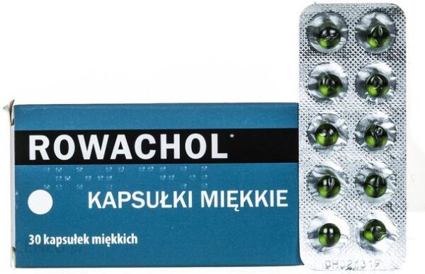 Rowachol jest lekiem, który powoduje ustępowanie łagodnych dolegliwości spowodowanych kamicą żółciową. Działa żółciopędnie zmniejszając zastój żółci, a także rozkurczająco zmniejszając dolegliwości bólowe w stanach skurczowych dróg żółciowych. Na podstawie danych doświadczalnych przyjmuje się, że systematyczne przyjmowanie preparatu ułatwia proces rozpadu istniejących kamieni cholesterolowych oraz zapobiega powstawaniu nowych.Dlaczego warto stosować Rowachol?• Ułatwia rozpad i eliminację kamieni, zmniejsza endogenną produkcję cholesterolu, obniżając jego stężenie w żółci i wspomagając rozpuszczanie kamieni cholesterolowych• Chroni przed ponownym powstawaniem kamieni, poprawia metabolizm wątrobowy oraz korzystnie wpływa na skład i wydzielanie żółci• Działa żółciotwórczo i żółciopędnie• Działa przeciwzapalnie i spazmolitycznie, rozluźnia mięśnie gładkie dróg żółciowych, zmniejszając dolegliwości bólowe• Działa przeciwbakteryjnie• Łagodzi objawy niestrawnościKiedy zalecane jest stosowanie Rowacholu?•Leczenie łagodnych dolegliwości spowodowanych kamicą żółciową, profilaktyka kamicy dróg żółciowych, stany skurczowe dróg żółciowych, dyskineza dróg żółciowych•Przed i po zabiegach w obrębie dróg żółciowych (w zespole po cholecystektomii)SkładKapsułki miękkie – skład: Jedna kapsułka zawiera: α-pinen 13,6 mg, β-pinen 3,4 mg, Camphen 5,0 mg, Cineol 2,0 mg, Menthon 6,0 mg, Menthol 32,0 mg, Borneol 5,0 mg, substancje pomocnicze: Oliwa z oliwek 33,0 mg. Powłoczka kapsułki: żelatyna, glicerol 85%, hydroksybenzoesan etylu (sól sodowa), hydroksybenzoesan propylu (sól sodowa), wodny roztwór miedziowego kompleksu chlorofilu (E141).Środki ostrożnościZachowawcze leczenie kamicy w przewodzie żółciowym wspólnym powinno się rozpocząć ze świadomością, że może prowadzić do komplikacji klinicznych takich jak: żółtaczka zaporowa, wstępujące zapalenie dróg żółciowych, zapalenie trzustki i innych. Lekarz powinien mieć świadomość konieczności poinformowania pacjenta (szczególnie pacjentów w starszym wieku) o niezbędności podjęcia wymaganych środków.Lek należy przechowywać w miejscu niedostępnym i niewidocznym dla dzieci. Przechowywać w temperaturze poniżej 25°C