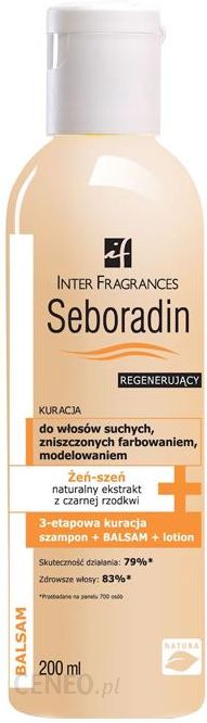 WSKAZANIA:Włosy suche, zniszczone farbowaniem i modelowaniem, prostowaniem, suszeniem. Dla kobiet i mężczyzn.DZIAŁANIE I EFEKT:Balsam to preparat dobierany do łodygi włosa. Zawiera korzeń żeń-szenia, który pobudza włosy do odrostu, odżywia, energizuje, dotlenia skórę głowy i włosy. Olej rycynowy i olej jojoba doskonale nawilżają, pielęgnują, nadają gładkość i połysk na całej długości włosów. Ekstrakt z czarnej rzodkwi wzmacnia włosy i zapobiega ich łamaniu się. Preparat posiada naturalne antyoksydanty zawarte w ekstraktach ziołowych. Balsam zapobiega elektryzowaniu się włosów, ułatwia rozczesywanie. Włosy są zregenerowane, odżywione, nawilżone, lśniące i miękkie. Skuteczność potwierdzona przez niezależne, specjalistyczne laboratorium badawcze – test samooceny pod kontrolą dermatologiczną.SPOSÓB UŻYCIA:Nanieść na umyte włosy odpowiednio dobranym do skóry głowy szamponem SEBORADIN, rozprowadzić, wmasować we włosy. Spłukać po 3-5 min. Do codziennego stosowania. Nie obciąża włosów. Zaleca się stosowanie z odpowiednio dobranymi preparatami SEBORADIN.Charakterystyczny zapach preparatu pochodzi z naturalnych, aktywnie działających ekstraktów roślinnych. Zapach ulatnia się po wysuszeniu włosów.Pojemność 200 ml