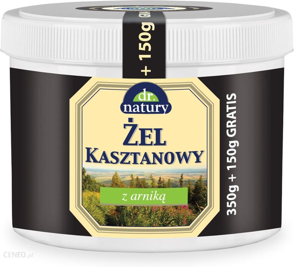 DR. NATURY – żel kasztanowy z arniką – działanie:Poprawia estetykę i wygląd pajączków naczyniowych. Działa łagodząco i odprężająco.Stosowanie:Nanieść żel na skórę i wmasować. W miarę potrzeb można stosować kilka razy dziennie. Po użyciu umyć ręce.Wskazania:Zalecany dla osób ze skórą skłonną do pajączków naczyniowych wykonujących stojącą i siedzącą pracę. Do masażu nóg i stóp.Produkt przeznaczony do użytku zewnętrznego. Nie stosować na otwarte rany oraz w okolicach oczu, nosa i ust.Skład według INCI:Aqua, Isopropyl Alcohol, Propylene Glycol/ Arnica Montana Extract, Glycerin Aesculus Hippocastanum Extract, Scutellaria Baicalensis Extract, Vitis Vinifera Leaf Extract/ Sodium Benzoate, Potassium Sorbate, Menthol, Camphor, polysorbate 20, carbomer, Sodium Hydroxide, PEG40 Hydrogenated Castor Oil, Parfum, Benzyl Salicylate, DLimonene, Eugenol, Linalool, Cl 42090, Cl 14720, Cl 19140.Pojemność opakowania:350g + 150g GRATISProducent:SEWMED Medical s.c.ul.Portowa 844-100 Gliwice