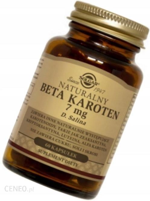 SOLGAR Naturalny Beta Karoten 7mg 60 kapsSolgar Naturalny Beta Karoten to preparat wspomagający opalanie w formie kapsułek (60 kapsułek). Beta-karoten to cenny składnik diety osób dbających o zdrową skórę. Nie tylko kumuluje się w skórze I wpływa na jej kolor, ale i chroni przed promieniami UV, co może być szczególnie istotne latem, gdy częściej się opalamy.Produkt firmy Solgar to odrobina oceanu w kapsułce. Jest to bowiem naturalne źródło oceanicznego beta-karotenu pozyskiwanego z połyskujących pięknymi odcieniami czerwieni alg D. salina. Zawiera inne naturalnie w nich występujące karotenoidy: alfa-karoten, kryptoksantynę, zeaksantynę, luteinę.