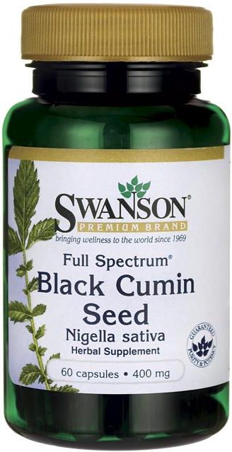 Skład 1 kapsułki:Czarny kmin (Nigella sativa) (nasiona) 400mgSkład:Czarny kmin, żelatyna (otoczka kapsułki), mikrokrystaliczna celuloza (substancja wypełniająca), stearynian magnezu i/lub krzemionka (substancje przeciwzbrylające)Sposób użycia:Jedna kapsułka 1-2 razy dziennieNie przekraczać zalecanej porcji do spożycia w ciągu dnia.Produkt nie może być stosowany jako substytut prawidłowo zróżnicowanej diety. Produkt niewskazany dla kobiet w ciąży i karmiących.Przechowywanie:Przechowywać w temperaturze pokojowej, w sposób niedostępny dla małych dzieci.Opakowanie:60 kapsułekData ważności – MFG Date:W związku z nowymi zasadami GMP (Dobra Praktyka Wytwarzania) firma Swanson Health Products zmieniła oznaczanie swoich produktów w zakresie daty przydatności do spożycia.Przy kodzie paskowym lub pod butelką szklaną występuje wyrażenie „Mfg date” – co oznacza datę produkcji.Wszystkie produkty mają dwa 2 lata ważności od daty produkcji, natomiast niektóre probiotyki jeden (1) rok. Jeśli na produkcie znajduje się „Mfg date 10/14” to produkt zachowuje swoją ważność do 10/2016.Informacje o producencie:Firma Swanson Health Products została założona w 1969 roku, jako wynik marzenia jednego człowieka o obdarowaniu całego świata dobrym zdrowiem. Do dzisiaj Firma kontynuując to marzenie, dociera do milionów ludzi świadomych swojego zdrowia w Stanach Zjednoczonych oraz na całym świecie.Swanson Health Products jest dumne ze swoich produktów i robi wszystko aby klienci byli w pełni zadowoleni. Te działania są czynione od początku istnienia firmy i przyniosły jej wiele splendoru oraz rzesze stałych, powracających klientów. Firma Swanson Health Products stara się aby:Cena produktu była możliwie najniższa.Czystość i Skuteczność była na jak najwyższym poziomie. Od kiedy firma szczyci się certyfikatem Dobrej Praktyki Wytwarzania (GMP) składniki są testowane na różnych etapach całego procesu produkcji w celu sprawdzenia czy- stości i mocy a gotowe produkty są badane przez niezależne laboratoria w celu potwierdzenia że, to co na etykiecie to jest w produkcie.