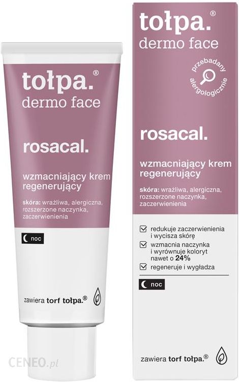 Skórze naczyniowej szkodzi prawie wszystko. Mróz, ciepło, wiatr, słońce, klimatyzacja, ogrzewanie, stres, używki. Pozostaje więc do wyboru: albo życie w skafandrze, albo pielęgnacja, która zredukuje nadwrażliwość. Regenerujący krem wzmacniający na noc tołpa dermo face rosacal wzmacnia naczynka krwionośne i regeneruje skórę w czasie snu. Wycisza rumień. Zmniejsza widoczność zaczerwienień i wyrównuje koloryt skóry. Wspomaga regenerację mikrouszkodzeń i łagodzi podrażnienia. Wygładza, przywraca komfort i wypoczęty wygląd.tołpa dermo face rosacal – regenerujący krem wzmacniający na noc, wskazania:skóra: wrażliwa, rozszerzone naczynka, zaczerwienienia.Składniki aktywne:torf tołpa.®, uszczelniający kompleks arniki, kasztanowca, oczaru, bluszczu, dziurawca i winorośli, wzmacniający ekstrakt z perełkowca japońskiego uelastyczniający ekstrakt z białego hibiskusa, przeciwzmarszczkowy ekstrakt z drzewa arganowego, łagodzący kompleks wody morskiej i ekstraktu z nasion dyni, ekstrakt z soi, masło sheaEfekty stosowania*:redukuje zaczerwienienia, wycisza skórę i przywraca komfort po pierwszym użyciuwyrównuje koloryt skóry średnio o ok. 7% po tygodniu stosowaniaregeneruje i wygładza skórę po 4 tygodniach stosowania* badania aparaturowe i dermatologiczne na grupie 43 osób.Sposób użycia:Nanieś krem na oczyszczoną i stonizowaną twarz omijając okolice oczu. Wmasuj zaczynając od szyi w górę. Stosuj codziennie wieczorem.Dodatkowe informacje:o każdej porze roku pamiętaj o stosowaniu kremu z filtrem SPFaby wzmocnić działanie kremu stosuj pod krem intensywny koncentrat wzmacniającydo mycia twarzy wybieraj delikatne kosmetyki bez mydła np. żel micelarnykrem umieszczono w aluminiowej tubie. Takie opakowanie nie zasysa powietrza i bakterii, dzięki czemu krem jest dłużej bezpiecznyBezpieczeństwo:Produkt przebadany w Klinice Dermatologii, Wenerologii i Alergologii Akademii Medycznej. Najlepiej jest przechowywać nasz kosmetyk w temperaturze pokojowej (15-25C).
