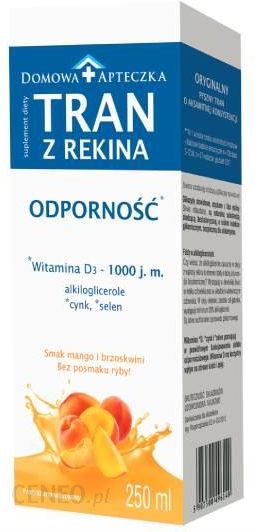 Tran z rekina grenlandzkiegoAlkiloglicerole obecne w mleku matek karmiących są zawarte także w oleju z wątroby rekina. Aktywują naturalne mechanizmy obronne organizmu. Pozostałe składniki zawarte w suplemencie diety „Tran z Rekina Grenlandzkiego” takie jak witamina A, C, D, E cynk oraz selen pomagają w prawidłowym funkcjonowaniu układu odpornościowego. Dodatkowo wywierają korzystny wpływ na zdrowe kości i zęby (witamina C, D), skórę i włosy (cynk) oraz paznokcie (selen), pomagają także chronić komórki przed stresem oksydacyjnym (witamina C, E). Rekin to ryba odporna na wszelkie choroby, długowieczna, bardzo szybko regenerująca swe siły. Tran z wątroby rekina od wieków znany medycynie ludowej, szczególnie krajów skandynawskich, doceniany jest także w XXI wieku ze względu na swe szczególne właściwości. Sekret tkwi w substancjach zawartych w wątrobie rekina grenlandzkiego. Są to m.in. alkiloglicerole, skwalen.Zastosowanie: składniki preparatu wspomagają odporność organizmu.Zalecane spożycie: dzieci w wieku 1-3 lat: 1 łyżeczka dziennie (5ml). Dzieci powyżej 3 lat i osoby dorosłe: 2 łyżeczkidziennie (10ml).Składniki: EmulOil: [ substancja wypełniająca (malitole), olej z wątroby rekina grenlandzkiego, woda, emulgator (mono- i diglicerydy kwasów tłuszczowych), substancje zagęszczające (sól sodowa oktenylobursztninu skrobioweg, guma ksantanowa),aromatyl]; woda, kwas L-askorbinowy; maltodekstryna; octan DL-alfa-tokoferylu; tlenek cynku; regulator kwasowośc (kwas cytyrnowy); substancje konserwujące (benzoesan sodu; sorbinian potasu); przeciwutleniacz (estry kwasów tłuszczowych i kwasu askorbinowego); naturalny barwnik (ryboflawina); octan retinylu; selenian (IV) sodu; cholekalcyferol.1 łyżeczka syropu zawiera: 1011mg oleju z wątroby rekina grenlandzkiego (w tym 202mg alkilogliceroli), 40mg witaminy C (50%)*, 6mg witaminy E (50%)*; 2,5mg cynku (25%)*, 400mcg witaminy A (50%)*, 14mcg selenu (25%)*; 2,5mcg witaminy D (50%)*.*RWS – procent referencyjnej wartości spożyciaPrzeciwwskazania: niewskazane dla osób uczulonych na jakikolwiek składnik preparatu. Kobiety w ciąży i karmiące piersią: należy skonsultować się z lekarzem.Ważne wskazówki:Nie należy przekraczać zalecanej porcji do spożycia w ciągu dnia.Suplementy diety nie mogą być stosowane jako substytut zróżnicowanej diety.Zrównoważony sposób żywienia i zdrowy tryb życia są ważne.Spożycie w nadmiernych ilościach może mieć efekt przeczyszczający.W procesie produkcji nie użyto cukru.Po otwarciu przechowywać w lodówce.Po otwarciu butelki, produkt należy spożyć w ciągu 60 dni.Osad w butelce jest procesem naturalnym.Zawiera substancje słodzącą: glikozydy stewiowe.