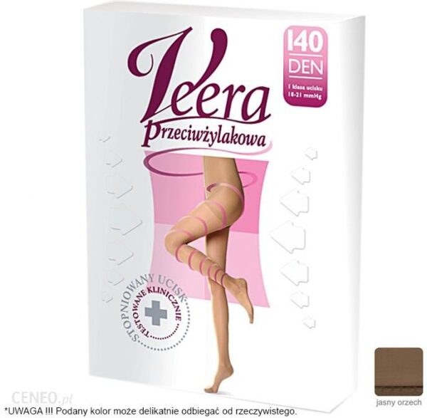 Eleganckie rajstopy ze stopniowanym uciskiem, testowanym klinicznie. Każdego dnia dbają o zdrowie i jednocześnie o piękno Twoich nóg.Wyglądają jak klasyczne rajstopy, a znacznie się różnią właściwościami: przynoszą ulgę zmęczonym nogom, poprawiają krążenie krwi, zapobiegają pierwszym zmianom żylakowym, zapobiegają pojawianiu się pajączków,sprawiają, że po całym dniu Twoje nogi są nadal lekkie.Veera zapobiega zastojom krwi żylnej, obrzękom oraz pękaniu drobnych naczynek (pajączków). Chroń swoje nogi. Niech będą zdrowe i piękne przez długie lata. Produkty Veera to linia produktów najwyższej jakości. Są przetestowane klinicznie, co zapewnia ich skuteczność. Prawie każda kobieta codziennie nosi rajstopy, podkolanówki, pończochy – Veera jest stworzona dla kobiet, które dbają o swoje nogi.Dzięki włóknom Lycry oraz wzmocnionej pięcie i palcach, rajstopy są trwałe i zapewniają prawidłowe ułożenie wyrobu na nodze oraz właściwe rozmieszczenie ucisku.Skład: 78% Poliamid,22% Elastan.Rozmiar: rozmiar ubrania: 42-44, obwód w kostce: 26-27.Produkt użytku osobistego, podlega zwrotowi tylko w nienaruszonym opakowaniu, bez żadnych śladów użytkowania.