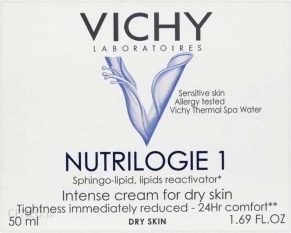 Sucha skóra nie jest w stanie prawidłowo wytwarzać własnych lipidów. W rezultacie ich niedoboru staje się szorstka w dotyku, ściągnięta, pojawiają się na niej zaczerwienienia, jest mniej elastyczna. Sfingolipidy: owoc 10 lat badań naukowych, nie tylko uzupełniają niedobór lipidów w skórze, ale także ponownie uczą ją jak naturalnie wytwarzać własne lipidy. Prowadzą do odbudowy bariery hydrolipidowej przeciwdziałajacej nadmiernej utracie wody przez skórę. Twoja skóra jest natychmiast ukojona. Suchość i ściągnięcie skóry znikają. Skóra jest znowu elastyczna i pełna komfortu przez 24 godziny od zastosowania. Skóra sucha stopniowo powraca do stanu normalnego. W ciągu 28 dni odzyskuje właściwy poziom nawilżenia.Wzbogacony w Wodę Termalną z Vichy o działaniu kojącym, wzmacniającym i regnerujacym skórę, krem Nutrilogie 1 zapewnia Twojej skórze 24 godzinne nawilżenie dla 24 godzinego uczucia komfortu. Odpowiedni dla delikatnej, wrażliwej skóry.Szybko wchłaniająca się, nietłusta konsystencja. Bogata w nienasycone kwasy tłuszczowe oraz oleje pochodzenia roślinnego przywraca skórze optymalny komfort przez cały dzień.