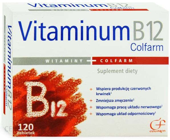 Vitaminum B 12 Colfarm, tabletki, 120 sztukSuplement diety wspierający produkcję czerwonych krwinek, zmniejszający zmęczenie oraz wspomagający pracę układu nerwowego oraz odpornościowego.Składniki:Skład: celuloza (substancja wypełniająca), cyjanokobalamina (witamina B12), hydroksypropylometyloceluloza (substancja glazurująca), sole magnezowe kwasów tłuszczowych, dwutlenek krzemu (substancje przeciwzbrylające), glikol polietylenowy (substancja glazurująca).Porcja zawiera:Ilość tabletek Witamina B12 ZDS*1 9 mcg 360 %* Zalecane Dzienne SpożycieWłaściwości składników:Witamina B12 wspomaga prawidłowe funkcjonowanie układu odpornościowego oraz prawidłową produkcję czerwonych krwinek. Przyczynia się do utrzymania prawidłowego metabolizmu energetycznego oraz prawidłowego metabolizmu homocysteiny.Witamina B12 pomaga w utrzymaniu prawidłowych funkcji psychologicznych i w prawidłowym funkcjonowaniu układu nerwowego. Przyczynia się do zmniejszenia zmęczenia i znużenia.Zalecane dzienne spożycie:1 tabletka 1 raz dziennie.Ostrzeżenia dotyczące bezpieczeństwa: Nie stosować w przypadku uczulenia na którykolwiek ze składników produktu. Nie stosować u kobiet w ciąży i karmiących piersią. Nie należy przekraczać zalecanej dziennej porcji. Dla utrzymania prawidłowego stanu zdrowia należy stosować zróżnicowaną dietę i prowadzić zdrowy tryb życia. Suplement diety nie może być stosowany jak substytut (zamiennik) zróżnicowanej diety. Przechowywać w temperaturze pokojowej. Suplementy diety powinny być przechowywane w sposób niedostępny dla małych dzieci.