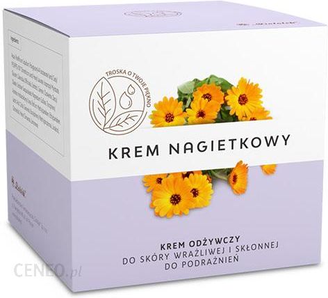Działanie:Krem nagietkowy – nawilża, wygładza i odżywia skórę, – działa antyoksydacyjnie i opóźnia procesy starzenia zachodzące w skórze, – także dla skóry ze skłonnością do podrażnień, pierzchnięć i zaczerwienienia, – doskonale się wchłania, idealny pod makijaż. Nagietek już w starożytnym Egipcie uważany był za środek odmładzający, a potwierdzenia jego skuteczności znajdujemy w wielu pismach średniowiecznych. ze względu na swoje dobroczynne właściwości, wyciąg z nagietka udoskonala nasz kolejny krem z serii Klasyka kosmetyki pielęgnacyjnej. Wszystkie preparaty wchodzące w skład serii zawierają naturalne składniki, które łagodzą podrażnienia i wspomagają procesy regeneracji naskórka. Krem nagietkowy doskonale nawilża skórę, wygładza ją i odżywia. Jego skuteczność zwiększa witamina E, znana powszechnie jako witamina młodości. Polecany jest do skóry suchej i normalnej, a zwłaszcza wrażliwej, przesuszonej, ze skłonnością do podrażnień, zmarszczek, pierzchnięć, zaczerwienienia. Jest doskonałym preparatem dla osób świadomych potrzeb swojej skóry, szukających rozwiązań naturalnych, niosących ukojenie i zapewniających komfort.